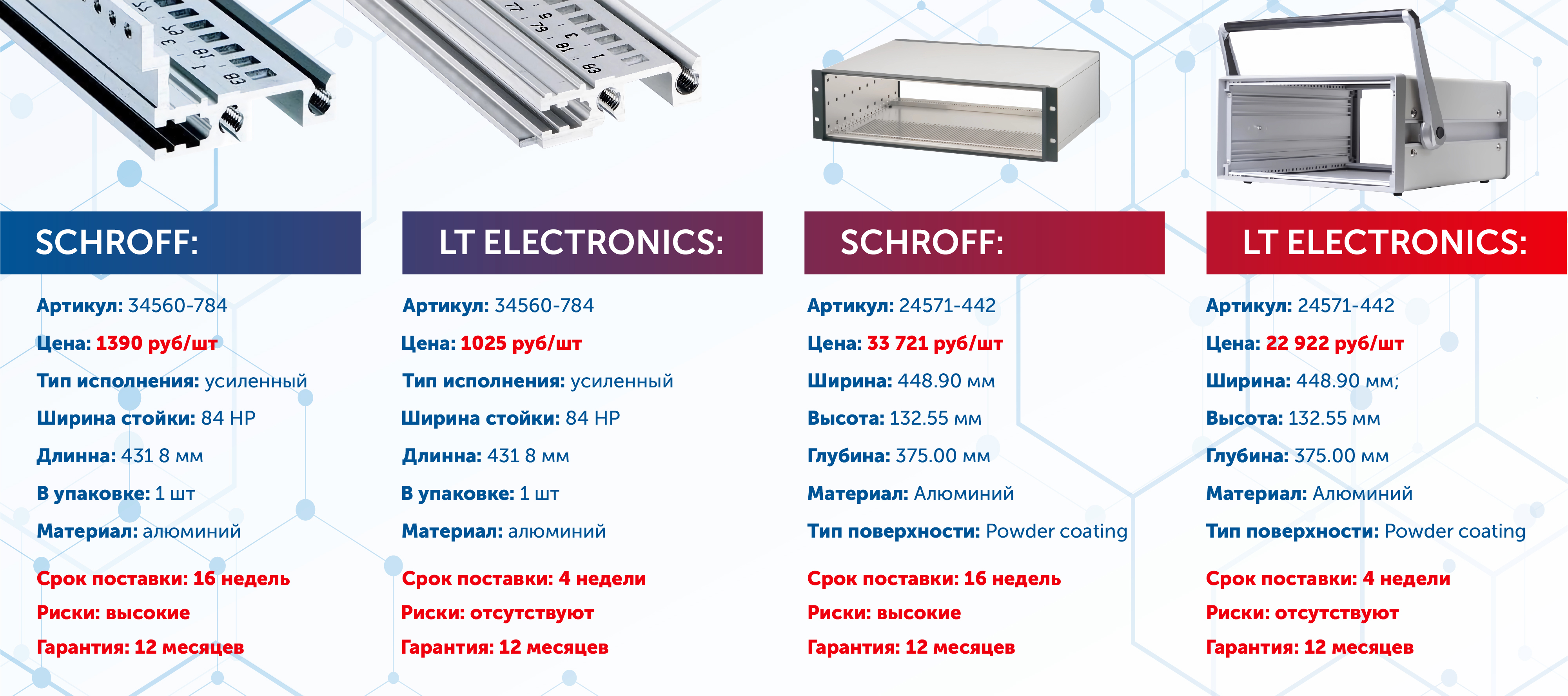 Поставки nVent Schroff составляют сегодня более 16 недель и затягиваются по времени с высокими рисками не получить товар из-за санкций. ITC-Electronics продолжает поставки Schroff, но очевидно, ситуация с поставками будет сильно хуже на многие годы вперед. Возникает вопрос: чем заменить Schroff? Мы предлагаем аналогичное оборудование от производителя LT ELECTRONICS CO., LTD. Ассортимент компании защищен от санкций и логистических проблем, а сроки поставки составляют 4 недели. Оборудование LT ELECTRONICS представлено 32 продуктами из 18 категорий - их качество можно сравнить характеристиками ходовой продукции Schroff и LT ELECTRONICS. Ниже представлено визуальное и техническое сравнение оборудования Schroff с LT ELECTRONICS. Горизонтальная рейка Приборный корпус Остались вопросы? 8 (800) 777-65-97, доп. 1117 или order@tedi24.pro - присылайте ваши спецификации, мы подберем аналоги, поможем с изменением конструкторской документации и предоставим бесплатные образцы. Цены на оборудование LT ELECTRONICS CO., LTD. розничные, при оптовых закупках предоставим скидки. Cмотрите каталог со складскими остатками SCHROFF - это находится на нашем складе в Санкт-Петербурге Скачайте наши складские остатки в Excel - это находится на нашем складе в Санкт-Петербурге