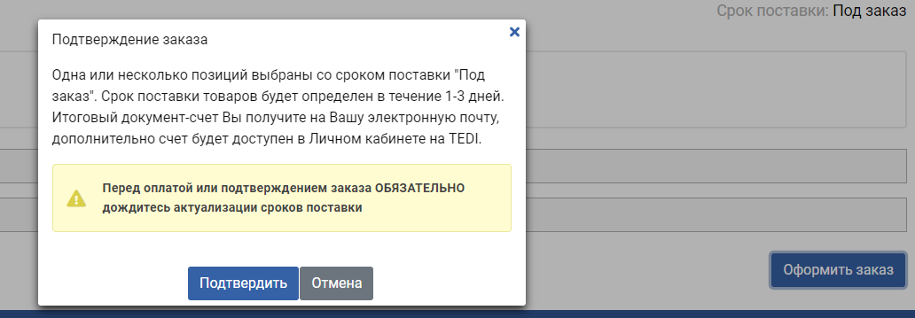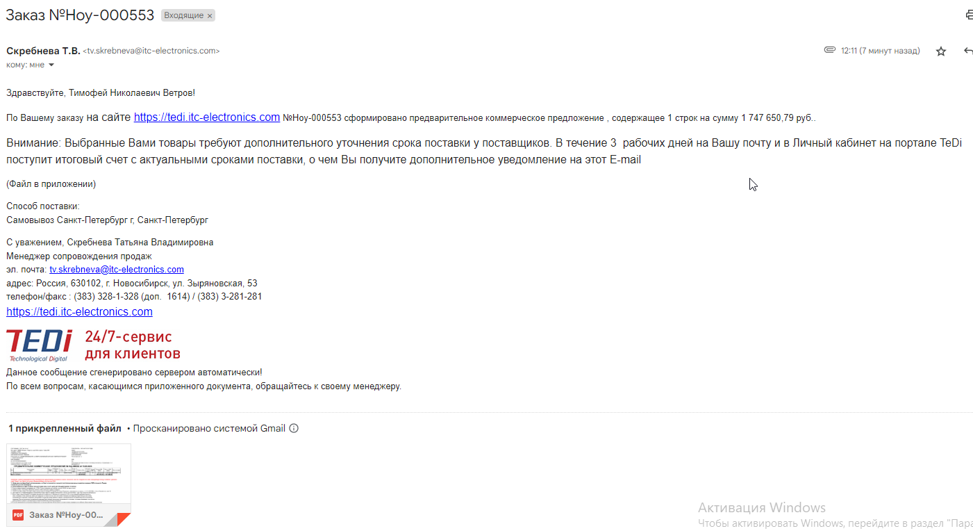 Уважаемые коллеги, друзья! ITC-Electronics поставляет широкий перечень оборудования от разных производителей, начиная с таких известных брендов, как, Siemens, Schneider Electric, ABB, Phoenix Contact и другие, заканчивая менее известными производителями, которые не уступают по качеству и надежности популярным брендам, например, ведущий индийский производитель клеммных колодок, ConnectWell, сертифицированный для атомной промышленности Индии. Кроме того, весь ассортимент продается по доступной цене, мы предоставляем бесплатные образцы для тестирования, обеспечиваем гарантийное обслуживание. Все оборудование, представленное на портале TeDi, оригинальное, имеет сертификаты и поставляется с необходимой документацией, таможенными документами и способом сборки и подключения, в кратчайшие сроки. Однако есть целый перечень оборудования, которое по объективным причинам, имеет статус поставки "Под заказ", например, Преобразователь частоты ATV630C16N4. Что это означает? Заявка на поставку данного преобразователя будет актуализирована менеджером по запросу заказчика. Когда заказчик добавляет в корзину и оформляет из корзины оборудование со сроком поставки "Под заказ" с портала TeDi, по умолчанию он увидит сообщение об актуализации сроков поставки позиции "Под заказ", как показано на скриншоте ниже: При подтверждении заказа, происходит автоматическое создание предварительного коммерческого предложения в формате .pdf, которое заказчик и его менеджер по сопровождению в ITC-Electronics получают вместе с электронным письмом, на свои E-mail (пример см. на скриншоте ниже - кликабельно). В предварительном КП заказчик может посмотреть выбранную позицию или позиции, цены и другую информацию, пока менеджер не актуализирует сроки поставки в течении 3-х рабочих дней и пришлет заказчику итоговый счет с актуальными сроками. При этом, предварительное КП не является счетом, оплачивать его не нужно. Обращаем внимание, что предварительное коммерческое предложение будет доступно в личном кабинете заказчика на TeDi в разделе "Список заказов". Предварительное КП можно скачать на свой компьютер в формате .pdf, а итоговый счет при актуализации сроков поставки менеджером, будет также доступен в личном кабинете для просмотра и скачивания. Позвоните нам по телефону 8 (800) 777-65-97 если нужно провести обучение сотрудников вашей компании по функционалу TeDi. Мы разработали интеллектуальный продукт TeDi, на котором можно расценивать сотни товаров одновременно за пару секунд, создавать за доли секунды счета, сравнивать оборудование между собой по техническим характеристикам и многое другое.