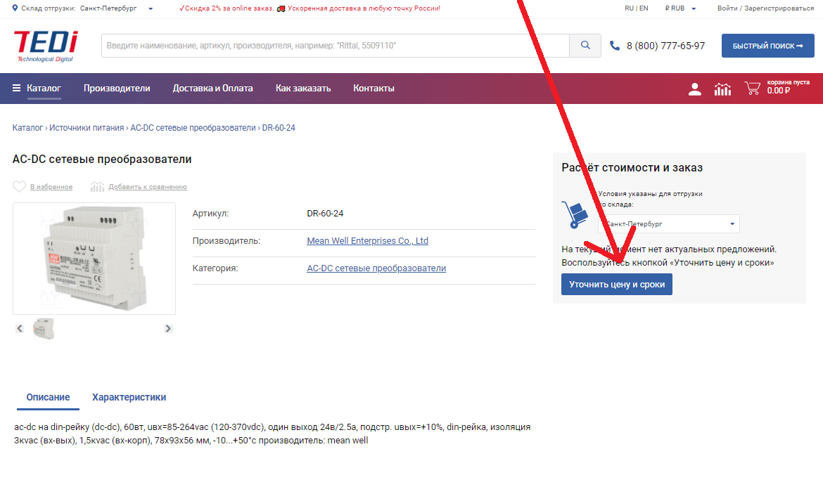 Теперь если на найденный вами товар нет цен и срока поставки, Вы можете воспользоваться нашим новым сервисом и получить предложение в течение 3-х дней! Всё что для этого нужно, лишь нажать на кнопку «Уточнить цену и сроки». Далее заполнить форму, email и номер телефона. В ближайшее время, Вам придет предложение по запросу на указанный email адрес. Остались вопросы? Пишите нам: help@tedi24.pro Или звоните по бесплатной горячей линии: 8 (800) 777-65-97 Нужно много разных товаров? Обработать спецификацию? Воспользуйтесь БЫСТРЫМ ПОИСКОМ!